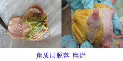 谷鳳柱教授還說,肌胃炎多和腺胃炎同時(shí)發(fā)生,但也可單獨(dú)發(fā)生,且對(duì)雞的危害大于腺胃炎。由于病因不同,臨床肌胃角質(zhì)層的病理變化也不盡相同。臨床上經(jīng)??吹郊∥附琴|(zhì)層的糜爛、崩解一定是發(fā)生了肌胃炎,但角質(zhì)層沒有糜爛不一定不是肌胃炎,要認(rèn)真辯證分析。如果發(fā)現(xiàn)角質(zhì)層已經(jīng)發(fā)生褪色、變淡,那么我們就應(yīng)該注意了。
