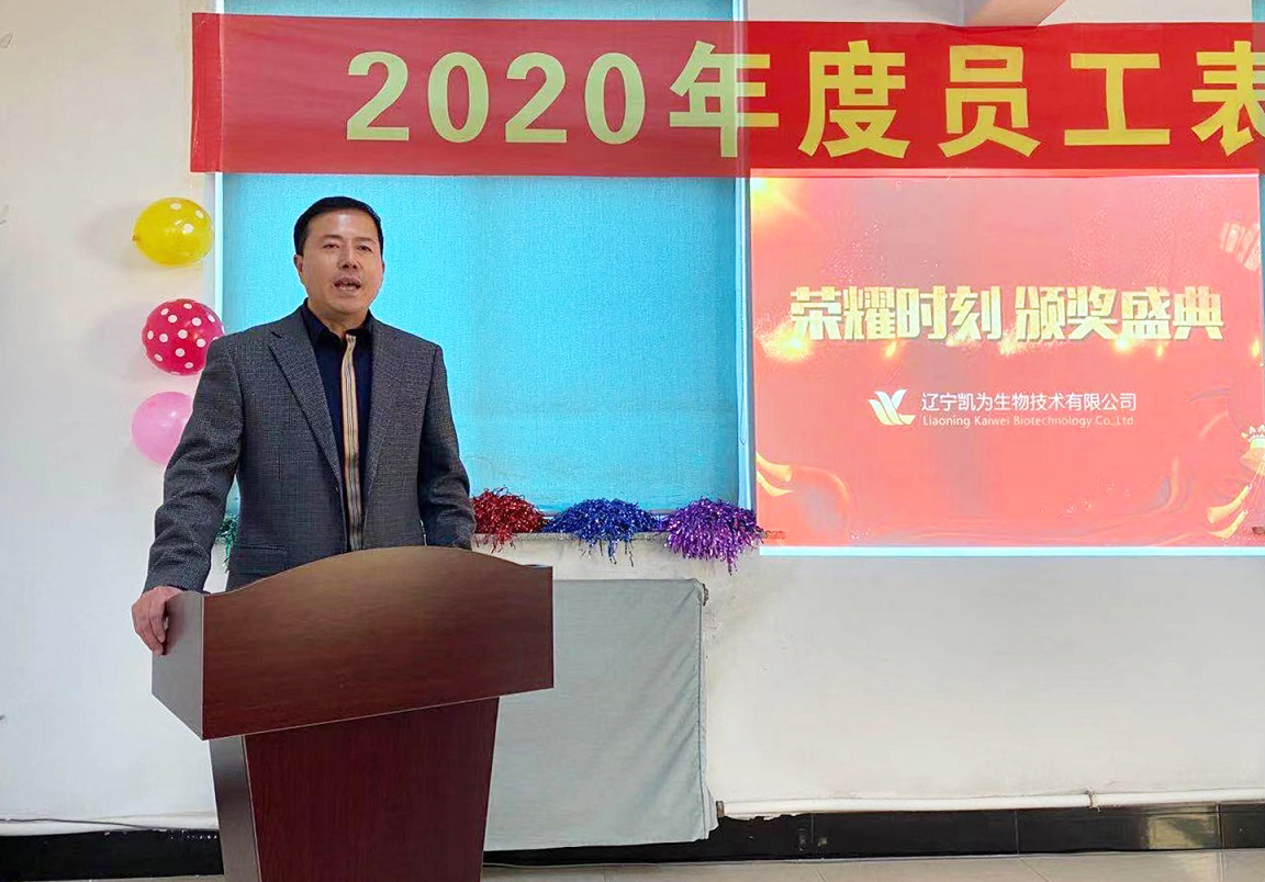 2021年1月9日,遼寧凱為生物技術(shù)有限公司2020年員工表彰大會于公司總部會議室成功召開,公司各級領導及全體員工應邀參會。表彰大會首先由公司總經(jīng)理王鐵良致2021年新年賀詞,隨后分別頒發(fā)了生產(chǎn)部優(yōu)秀員工獎、六年貢獻獎、十年貢獻獎和行政優(yōu)秀員工獎四個獎項。